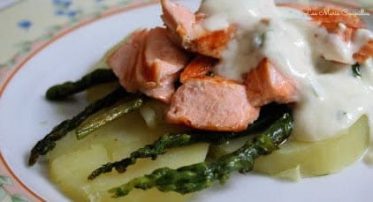 Peel the asparaguses and cook them with water and salt, during 10 minutes. Drain them and let them to cool down, wrap them in pairs with a salmon sheet, so that the tips are not covered, add some fish broth and bake them in the oven for 5 minutes.