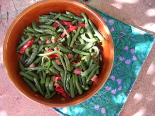 Earlier in bean season, I rarely did anything more complicated than blanch the beans and dress them with extra virgin olive oil. I love green beans fresh from the garden so much that I enjoyed them in solitary splendor rather than as a side dish. Although, heaped beside grilled fresh tuna and sliced tomatoes, an Andalusian take on niçoise salad, they were outstanding.