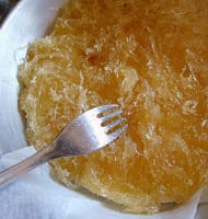 | A puff pastry tart is filled with golden strands of angel's hair and sweetened almonds. |