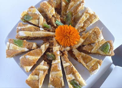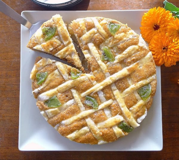 | A layer of sweet, golden angel's hair is topped with sweetened ground almonds and a lattice crust. |