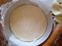 Lightly grease a 9-inch round cake pan and line it with baking parchment, leaving an overhang of the parchment to help in removing the tart from the pan.