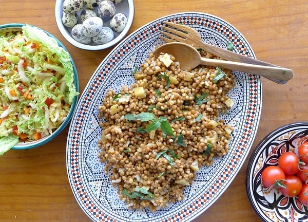 The “dressed” lentils, served cold or room temperature, are not a salad, but a side dish. They can take the place of a vegetable or of a boring carb such as potatoes. For that matter, with the addition of cubes of queso fresco or feta and quail eggs, the lentils easily become a vegetarian main.