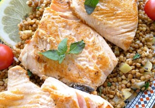 | Chilled or room temperature lentils accompany pan-grilled salmon. Slaw is a quick salad-relish. |