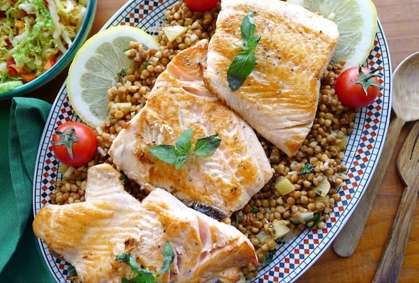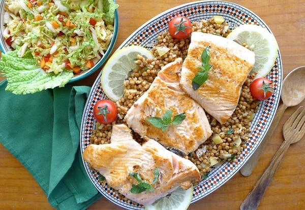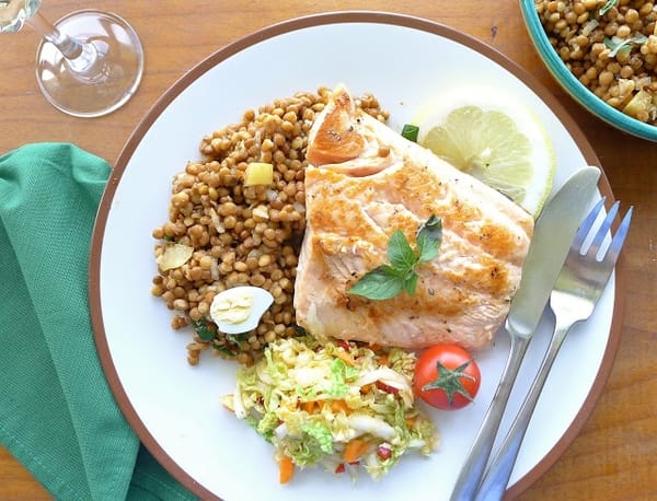 | Keeping it simple. This meal comes together in 30-40 minutes - lentils, pan-grilled salmon fillets and coleslaw. |
