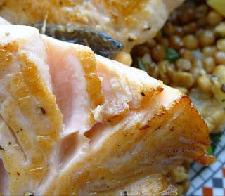 | To cook the salmon: Season the fillets with salt and pepper and drizzle them with olive oil. Allow to come to room temperature. Heat a plancha (grill pan) or cast iron skillet until quite hot. Place the fillets in the pan, skin side down. Lower heat to medium-hot. Allow the salmon to cook without moving it until the skin is crisped and flesh is cooked almost to the center. Carefully turn the fillets and finish cooking just until the reverse side is lightly browned. |