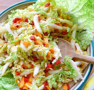 | Tangy slaw can serve as a sauce or relish with the grilled salmon. This is made with shredded Chinese cabbage, red bell pepper and diced carrots. No mayonnaise - the dressing includes olive oil, Sherry vinegar, a dribble of honey and a pinch of toasted cumin seeds. |