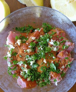 Remove fat covering from meat. Cut meat into 1 ½-inch pieces. Place in a non-reactive bowl. Add the spice blend, lemon juice, garlic, parsley and oil. Mix well to coat all of the meat. Cover and refrigerate for at least 1 hour or up to 8 hours.