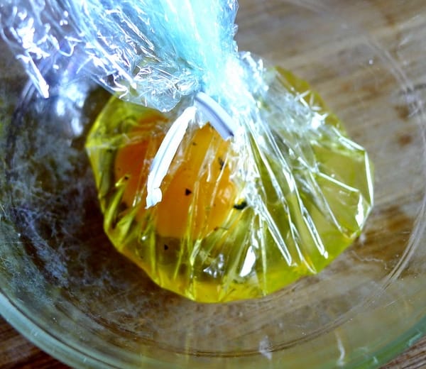 Cool way to poach eggs. Line a small bowl with plastic wrap. Add a little olive oil. Break an egg into the bowl. Sprinkle with salt and pepper. Twist the plastic to close tightly and tie. Submerge the egg packets in boiling water. Reduce heat to a simmer. Poach eggs 3 to 4 minutes. Remove the packets. Untie the plastic and carefully roll the eggs onto the plate of peas and ham.