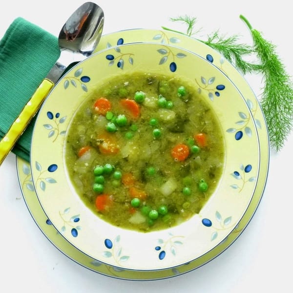 | For a rainy spring day - split-pea soup with carrots, chard and fresh peas. |