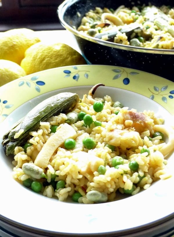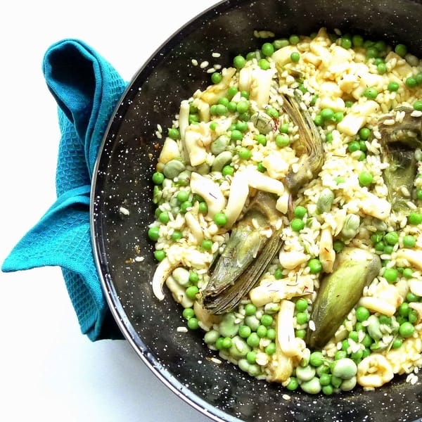 | Rice with cuttlefish, peas, fava beans and artichokes. |