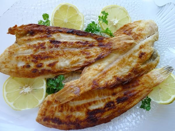 Sole, also known as Dover sole, solea solea, lenguado in Spanish, is a dextral flat fish (has eyes on the right side) with an elongated oval body rimmed by fins. The skin color varies from dark brown to olive-drab to grey. It has irregular splotching. The underside is whitish.