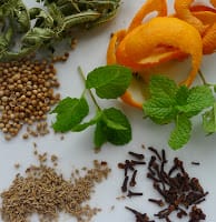 Combine the sugar with water in a saucepan. Bring to a boil and stir to dissolve the sugar. Add the orange zest, aniseed, coriander seed, and cloves. Cook gently for 5 minutes. Remove from heat and add the mint, lemon verbena and orange flower water, if using. Allow to cool for 20 minutes.