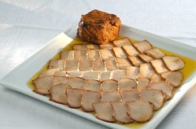 To serve, remove as many pork slices as desired from the lard and heat them briefly, turning as needed, in a skillet over high heat. Serve hot.