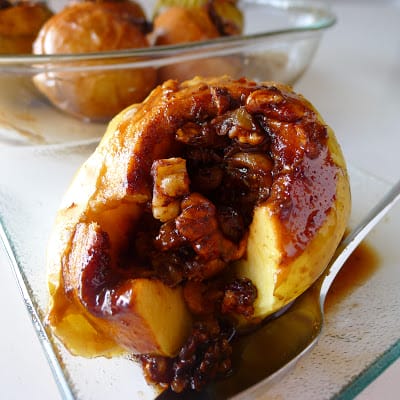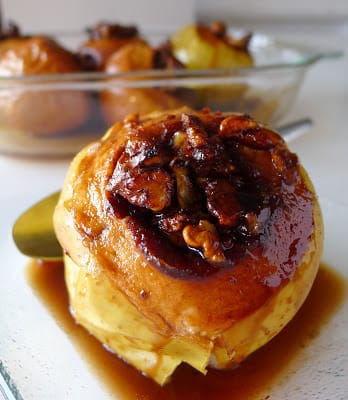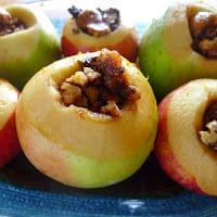 | Apples are stuffed with figs and walnuts, baked in sweet wine. |