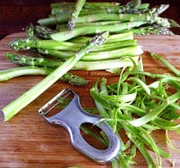 Cut the pepper into quarters, discarding stem and seeds. Use a vegetable peeler to shave outer skins from asparagus. (I tried asparagus both ways - actually prefer unpeeled, although they need a little longer on the grill.)