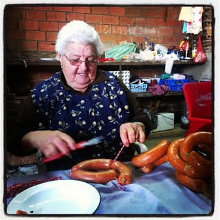 Once the meat is cut up, the women start the sausage making. The blood is gradually combined with a mixture of cooked rice, onions, spices and chopped pork fat. Using a big sausage funnel, they stuff the casings with the mixture. Once stuffed and tied off in links, the sausage is boiled in caldrons, then drained and hung from poles to dry for a week.