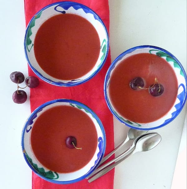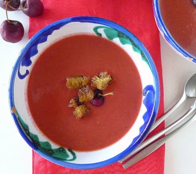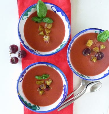 | Cherries add a subtle sweetness to traditional gazpacho. |