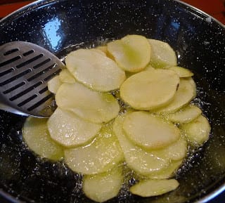 The potatoes don’t fry, but “poach” in olive oil. This is the same procedure used when cooking them for a Spanish tortilla. So use plenty of olive oil and, if necessary, cook the potatoes in two batches. They need to lightly brown on the edges and be tender, but they don’t need to be crisp, as they will finish in the garlic sauce.