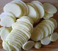 Peel the potatoes and cut them crosswise into ¼-inch slices. Place the slices in water. Drain the potatoes and pat dry on kitchen towels.