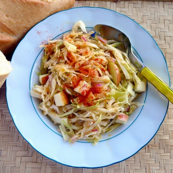 Place the cabbage and onion in a salad bowl and sprinkle with salt. Mix well and allow to stand for at least 30 minutes