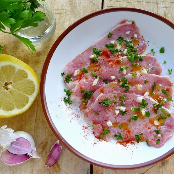 Marinate thinly sliced pork loin with salt, chopped garlic, chopped parsley, a pinch of pimentón (paprika) and a squeeze of lemon for 30 minutes. Quickly fry the slices in olive oil. Use the oil and drippings in the pan to dribble on the bread rolls.