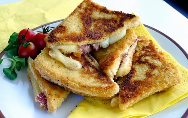 | These ham and cheese sandwiches are dipped in egg and fried. |