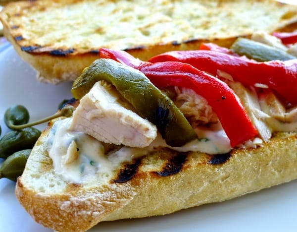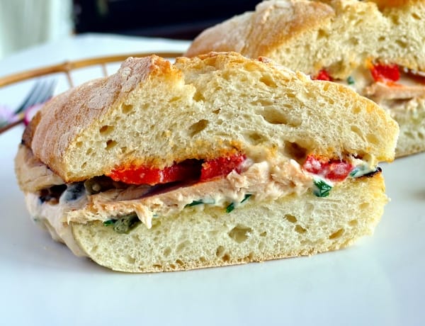 | Chunks of tuna, roasted peppers and a garlicky sauce. |