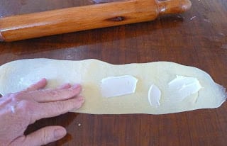 Lightly oil the work top and rolling pin. Place a ball on the surface, pat it to flatten and roll it out to a long rectangle (about 12 inches for a small roll; 25 inches for a big one). With the fingers, smear the surface of the dough generously with lard.