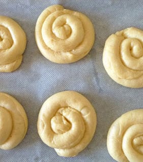 | Rolled cords of yeasted dough form the spiral rolls. |