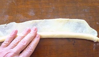 Cut a strip of dough off of one long side. Place it on the edge of the other long side and use it as a “core” to roll the dough around. Roll the dough into a long cord. Pick it up in the center and gently squeeze and stretch the cord towards the ends.