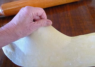 Working on the long sides, lift the dough and gently stretch it until very thin and transparent.
