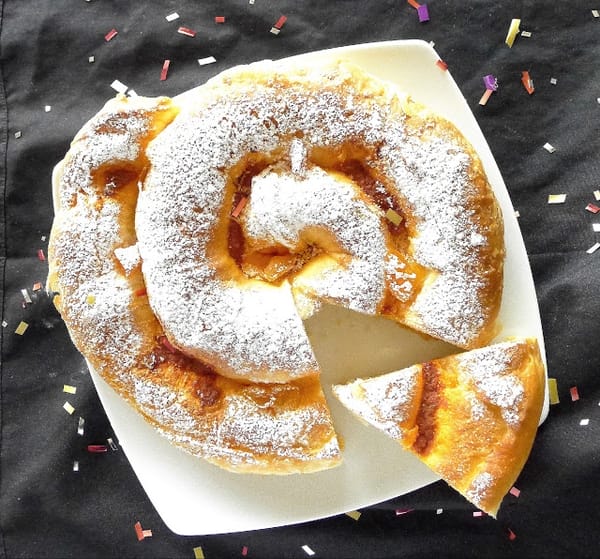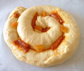 For Carnaval, the spiral roll is studded with slices of sobrasada, typical Mallorcan soft sausage, and slices of candied pumpkin.