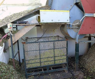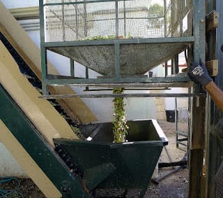 | First step, the olives are tumbled and air-blown in a hopper to remove leaves and dirt. Large scale growers usually down olives by vareo, thrashing the branches with sticks and gathering the fruit in tarps spread on the ground. Inevitably, leaves and twigs accumulate with the olives. I hand-pick olives, ordeñando, or "milking" them off the branches. So my olives are especially clean. Sometimes the jefe decides they don't need the leaf-blower. The olives drop into a bin that functions as a scales. |
