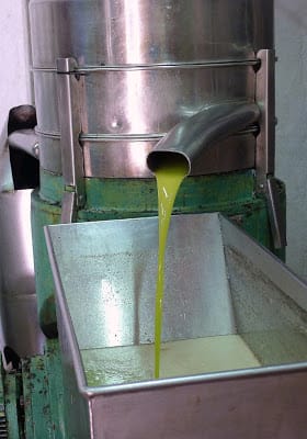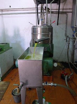 | Straight from the centrifugal extractor, new oil pours out. Fresh-squeezed olive juice. |