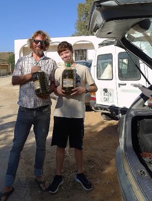 | Ben and Leo load three 5-liter jugs of oil. I'm up to 35 liters now and still more olives to pick! Hopefully, we'll finish by next week. |