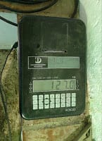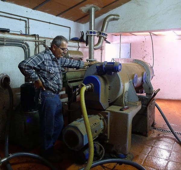 | Jesús Ayala monitors a modern olive oil extraction machine. The crushed olives are spun at high speed to separate the oil from the water. Forget that old phrase, "cold-pressed oil." Almost all olive oil in this day and age is extracted by a centrifugal process. Big cooperative factories have huge ones. This mill has a small one. During the milling season, the Ayala brothers run it seven days a week. |