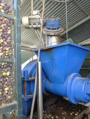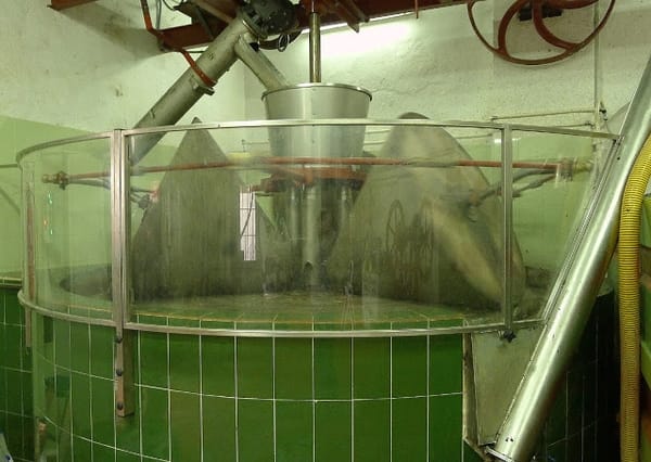 | Instead, olives go into this machine to be ground up by spinning steel wheels. |