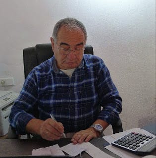 | Modesto Ayala figures out how much I've earned. I could take the money - hardly enough to buy lunch! But, I want the oil. Fifteen liters, he tells me. This is not from my own olives - I don't have enough olives at one time for the "run of the mill" (500 kilos). |