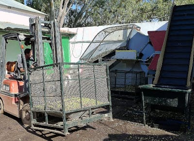 | A fork-lift loader moves my bin of olives to the loading chute. A week's worth of picking looks like nothing in that bin that holds 500 kilos! |