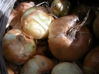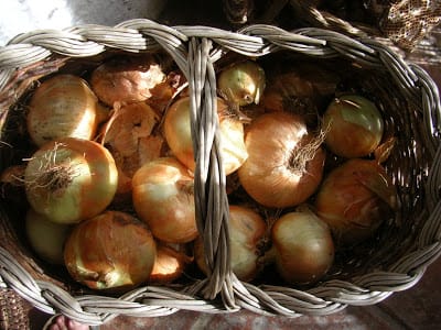 I am gloating over my new onion harvest—a basketful of big, golden onions that will last me several months. Stored in a cool, dry place, protected from light, they will keep until, in their natural cycle, they begin to sprout. Usually I have used them all up by then, but any that are sprouting can be replanted for an early crop of spring onions.