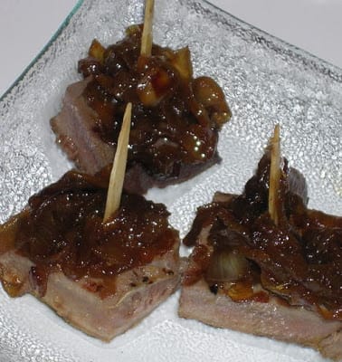 Use a sharp knife to remove and discard skin and dark section of tuna meat. For tapas, cut into 10 squares, approximately 1 ½ inch. Stick each piece on a pick and spoon over the onion confit. Serve warm or room temperature.