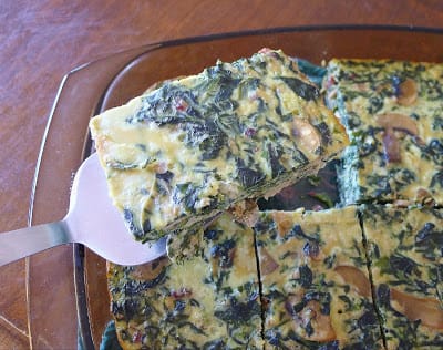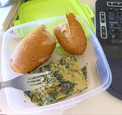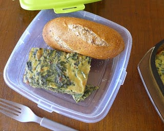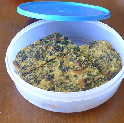 My favorite packed lunch is usually some variation on a vegetable timbale. Timbale is sort of like a quiche without a crust or a tortilla/frittata that is baked instead of cooked in a skillet. Cut into small squares, it can be eaten with the fingers (be sure to pack some paper towels!) or, with plastic spoon or fork, directly from the container.
