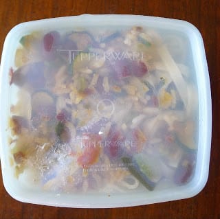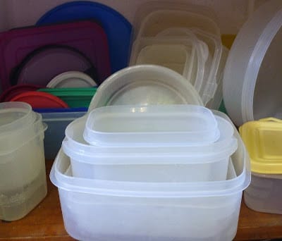 | My jumbled collection of plastic storage containers and lids - not Tupperware®. |