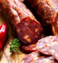 Chorizo: Every household in Spain has at least one or two of the hundreds of varieties of delicious chorizo sausages. The origins of this spicy sausage are quite old. There is documentation of the Roman praises of this product. The ingredients used to make it are lean pork, pork fat, salt, pepper, paprika, garlic. oregano and thyme. |