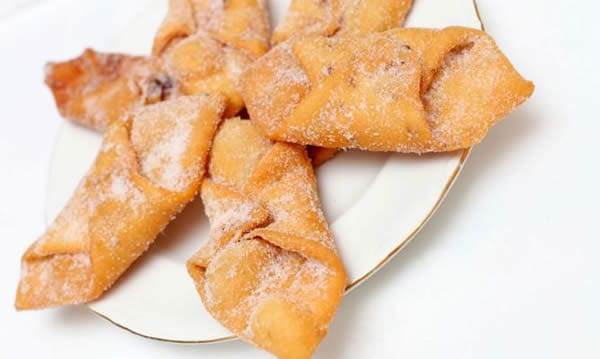Clean the work surface, dust again with flour, and roll out into a very thin 20-inch square. Cut the dough into 4-inch squares. You will have 25 squares. Working from a corner of each square, roll up the square on the diagonal, crating a cylinder with a 1/2-inch hollow center. To prevent the fritters from unfolding when you fry them, dampen your finger and press the point of the seam to the layer beneath it, sealing it in place.