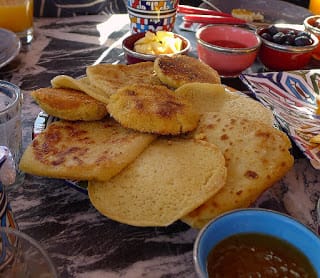 | Layered flat bread called rghaif, baked on a griddle. It is made with a yeast dough, folded and brushed with oil. (Kasbah Asmaa Hotel, Midelt.) |