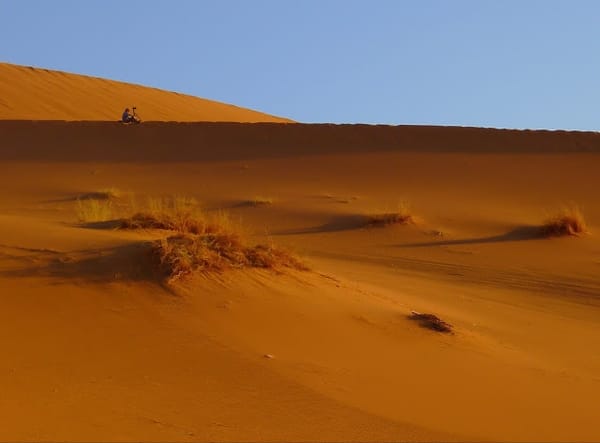 | One of our photo group has climbed part way up the Great Dune to capture the sunrise. |