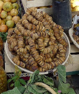| Dried figs strung together at a stall in the souk of Moulay Idriss. |
