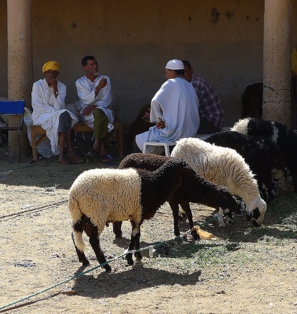 | Sheep market at the big souk in Rissani. Lamb is slaughtered for special festivals and for wedding feasts. |