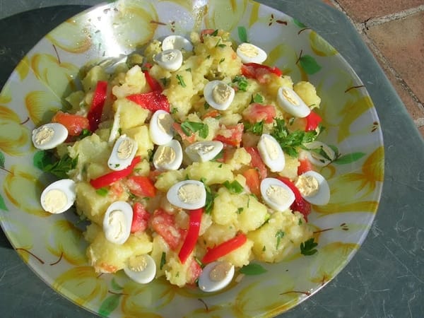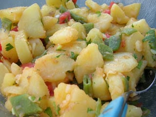 This salad often has chunks of canned tuna added to it. If you use a good brand of tuna in olive oil you can use the oil from the can to flavor the potatoes. The potato salad pictured at the top has sliced quails' eggs. The one to the right has sliced green beans added to the potatoes.